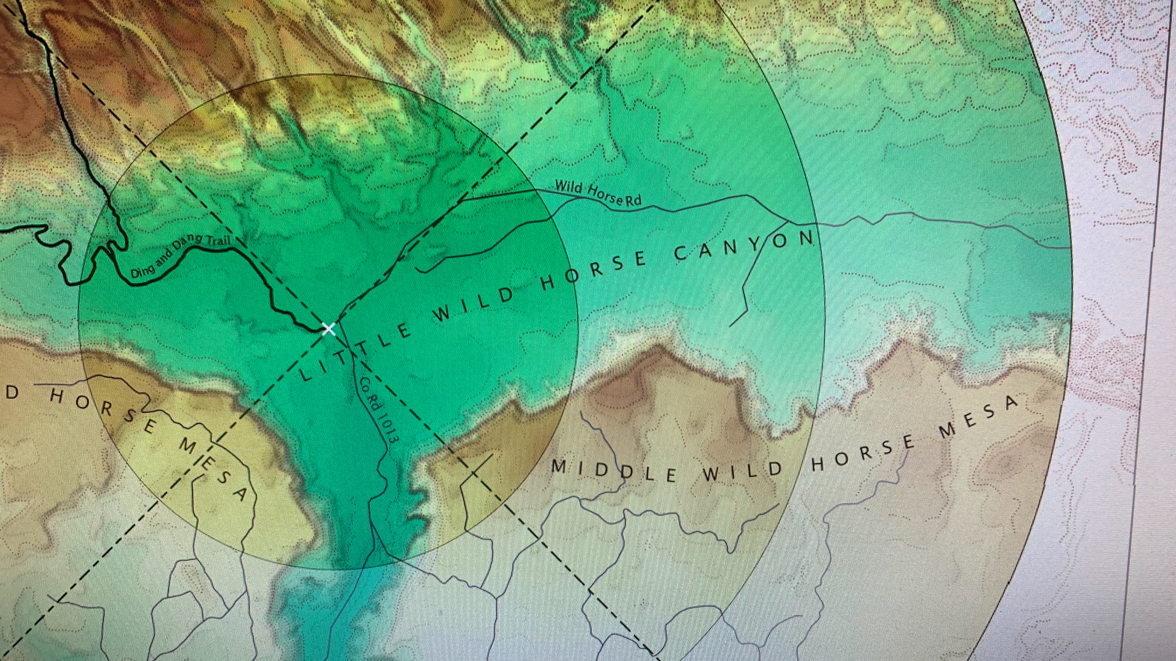 This map shows the surface distance from the trailhead of the Ding & Dang slot canyons at a 2.5 mile radius, to give the map user a sense of distance for a short 5 mile out and back hike. The elevation raster, with a custom hypsometric tint, is combined with a subtle MDOW hillshade as well as a Historic Dots hillshade. Elevation data comes from the USDA. All other features were created by the map designer, Mark Bellncula.