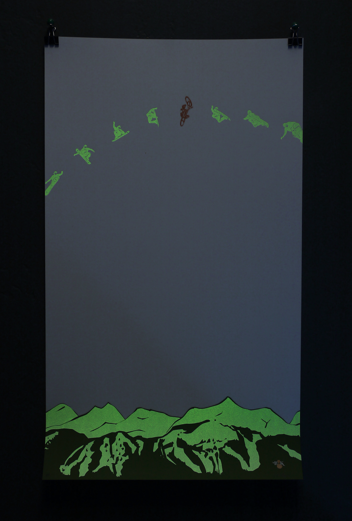Poster designed and sold at a special Art Crank held in Breckenridge for the 2015 Pro Challenge. The piece has two sides, summer and winter. Summer can be seen in normal light. Winter is glow-in-the-dark. Art Crank is about bikes, but this is a secret snowboard poster.